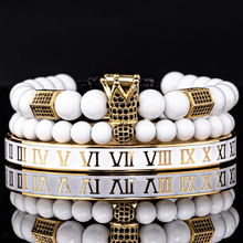 跨境批发欧美复古皇冠黑玛瑙编织手链罗马数字不锈钢手镯
