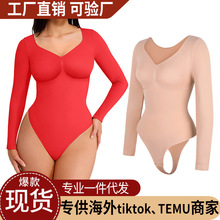 跨境爆款无缝塑身连体衣收腰束腹高弹紧身V领按扣长袖丁字款女士