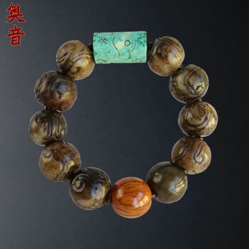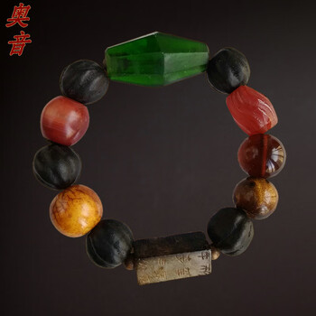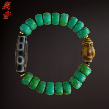 奥音S10藏传佛玛瑙特殊图腾爱心三眼老天珠无优化老绿松石多宝手串