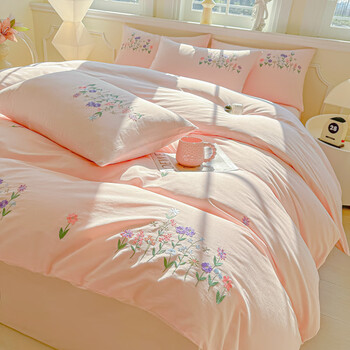 水星系列家纺小清新花卉刺绣100全棉四件套粉色被套纯棉床单少女心1.8床品