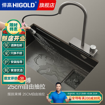 悍高 HIGOLD厨房水龙头304不锈钢旋转抽拉雨幕瀑布龙头多功能冷热水槽龙头