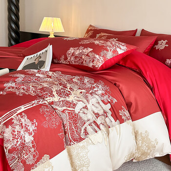 水星系列家纺中式婚庆刺绣四件套大红色喜被全棉纯棉被套床单床笠床上用品