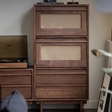 黑胡桃木边柜原木日式高柜沙发角柜家用立柜藤编置物柜客厅储物柜