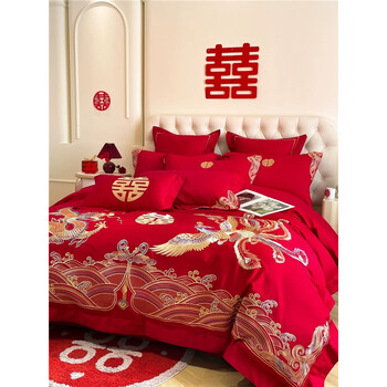 水星系列家纺高档龙凤刺绣结婚四件套大红色被套纯棉全棉婚庆床品婚房喜被