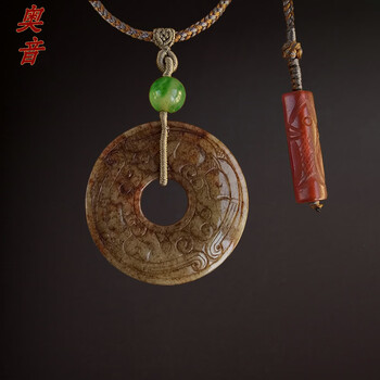 奥音汉代制式老和田玉双面雕饕蹏如意纹玉环项链*高端老玉收藏