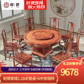 曦世 红木家具非洲花梨(学名:刺猬紫檀)实木餐桌 转盘圆餐桌台 中式餐桌椅组合