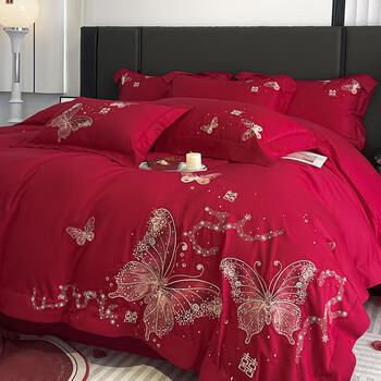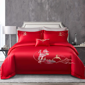 水星系列家纺婚庆A类全棉纯棉长绒棉四件套大红刺绣被套床单结婚陪嫁床品