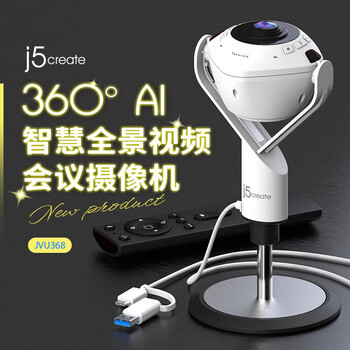 j5 create JVU368 360°智能 AI 500万广角全景视频会议摄像头高清直播网课摄影机全向麦克风人形追踪免驱动