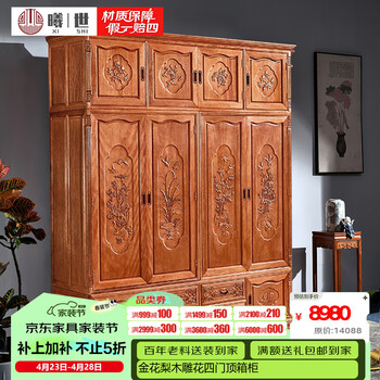 曦世深色名贵硬木金花梨木(学名:番龙眼)实木衣柜六门卧室衣柜顶箱柜
