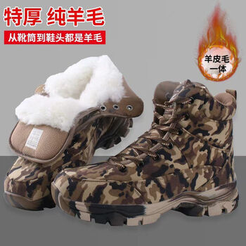 3537东北防寒靴高帮特厚保暖纯羊毛迷彩棉鞋男皮毛一体防水防滑雪地靴