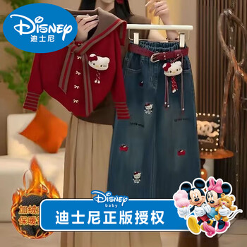 迪士尼女童加绒加厚牛仔裤2025冬季新款儿童一体绒阔腿裤中大童秋冬长裤