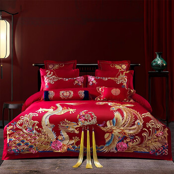 水星系列家纺婚庆A类全棉纯棉长绒棉四件套大红刺绣被套床单结婚陪嫁床品