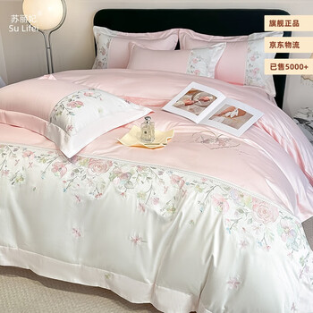 水星系列家纺轻奢风全棉长绒棉四件套花卉刺绣被套纯棉床单床笠高级感床品