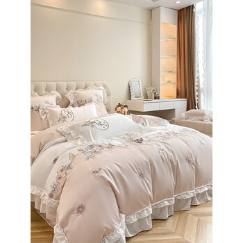 水星系列家纺小清新花卉刺绣100全棉四件套粉色被套纯棉床单少女心1.8床品